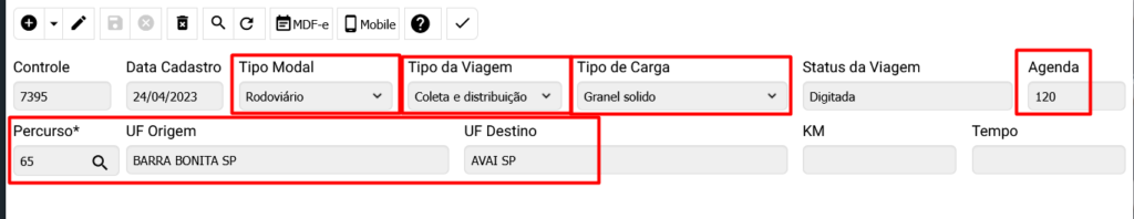 A viagem será gerada automaticamente cadastrando a informações basicas do cabeçalho como Tipo Modal, Tipo da Viagem, Tipo de Carga, Agenda(Não obrigatório) e o principal que é o Percurso, as informações podem ser alteradas clicando no ícone ![]()