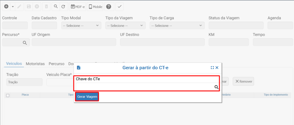 e na opção “Gerar à partir do CT-e” para cadastrar a viagem automaticamente baseado nas informações do CT-e.