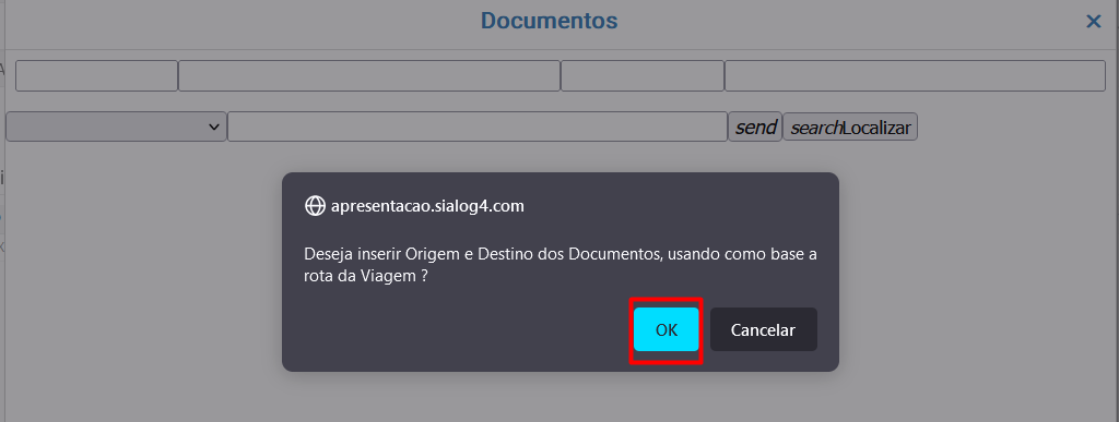 Clique em OK para inserir a Origem e o Destino dos documentos, usando como base a Rota da Viagem.