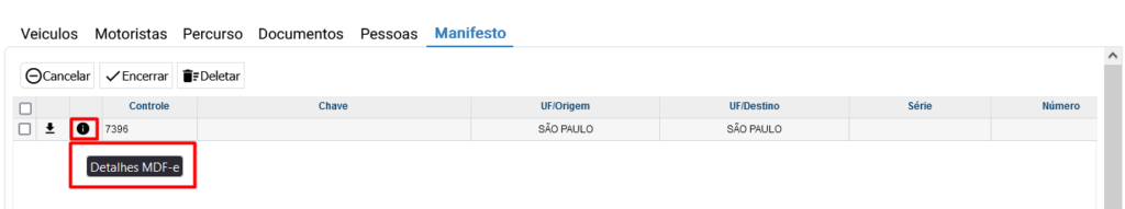 Após gerado o MDF-e clique no botão Detalhes MDF-e.