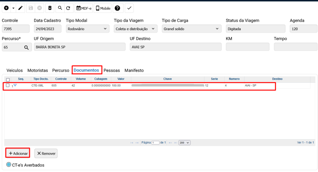 Abaixo na área de Itens, o valor do campo Nº Averbação é relacionado a averbação do CT-e, caso exista alguma integração com a Porto ou a AT&M, as averbações serão preenchidas automaticamente para cada CT-e informado na viagem e também o processo pode ser executado clicando no botão “Carregar averbações por CTe”.