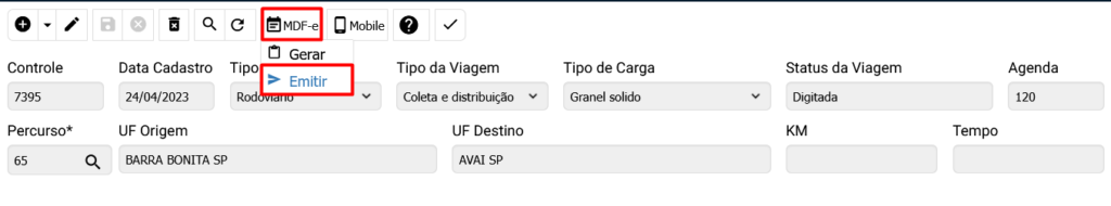 Após concluída todas as etapas de cadastro do MDF-e, clique no botão MDF-e >> Emitir.