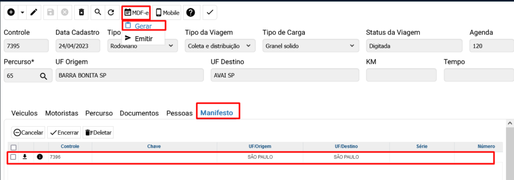 Depois de finalizado todas as informações da Viagem, clique no botão MDF-e >> Gerar, o mdfe será gerado na aba Manifesto.
