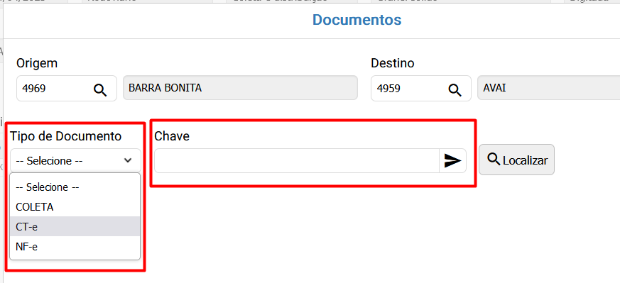 Selecione o Tipo de Documento Coleta, CT-e ou NF-e e informe a chave do documento, depois clique no ícone