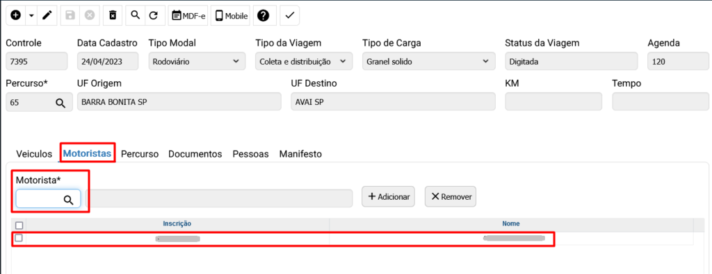 Acesse a aba Motoristas para adicionar o motorista da viagem