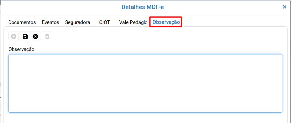 Acesse a aba Observação, esse campo é livre para adicionar qualquer informação relevante ao MDF-e