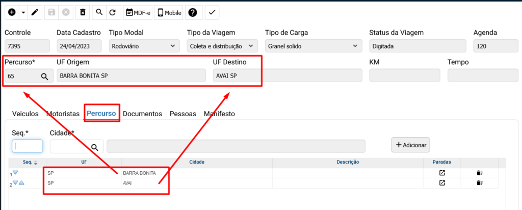Na aba Percurso, verifique se a Cidade Inicial e Final estão corretas e também os estados intermediários, o percurso pode ser alterado direto na viagem ou pela tela de cadastro de rotas.