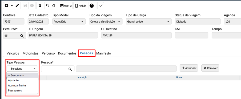 Na aba Pessoas adicione o Tipo de Pessoa que irá junto na viagem, seja um Ajudante, Acompanhante ou Passageiro.