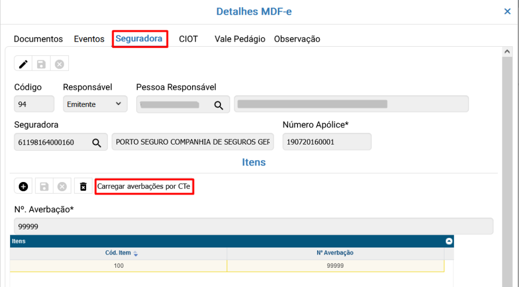 Acesse a aba Seguradora e confirme os dados da Pessoa Responsável, a Seguradora e o Número da Apólice, todos os dados serão preenchidos automaticamente de acordo com os parâmetros pré-cadastrados, caso tenha algum valor incorreto, clique no botão de edição