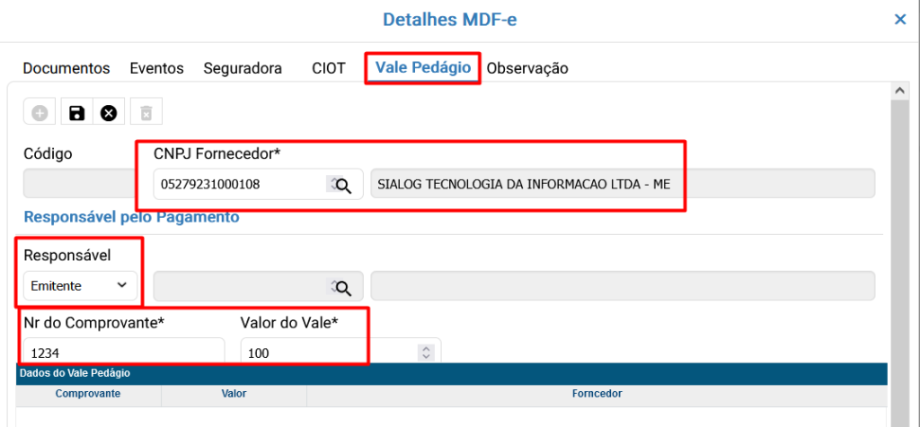 Acesse a aba Vale Pedágio e informe o CNPJ do Fornecedor , o Responsável, o Número do Comprovante e o Valor do Vale.