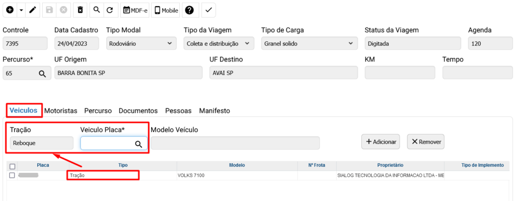Após verificado o cabeçalho da viagem, acesse a aba Veículos e adicione o Veículo Tração e depois os Atrelamentos ou Reboques, clique no botão