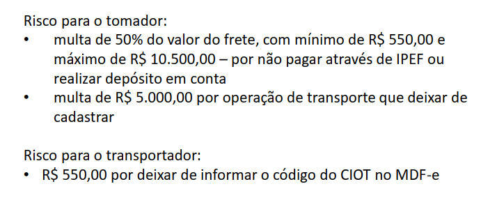 É importante saber que o não cumprimento aos procedimentos previstos nesta resolução acarretará multas no valor de R$ 550,00 a R$ 10.500,00 por infração cometida. Elas serão aplicáveis tanto para contratantes/subcontratantes, contratados e Instituições de Pagamento de Frete.