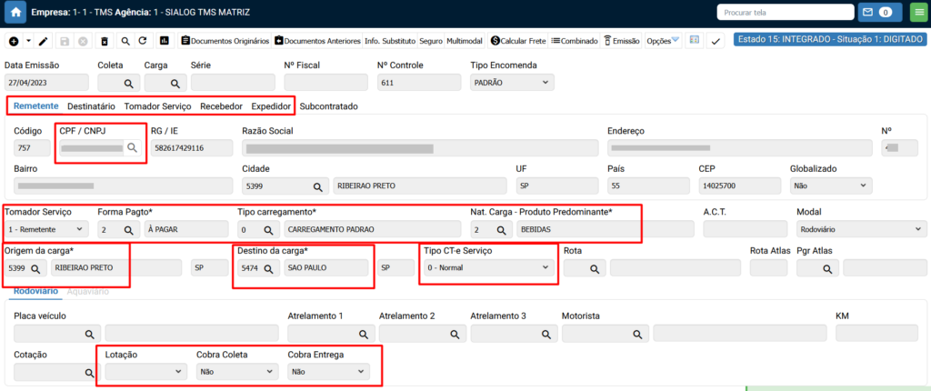 Após gerado o CT-e confira os campos obrigatórios para emissão, segue os campos abaixo: