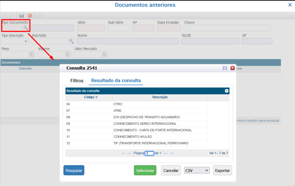 Informe o tipo de documento emitido anteriormente pela transportadora contratante da Subcontratação ou Redespacho.