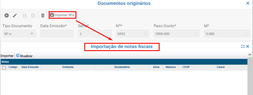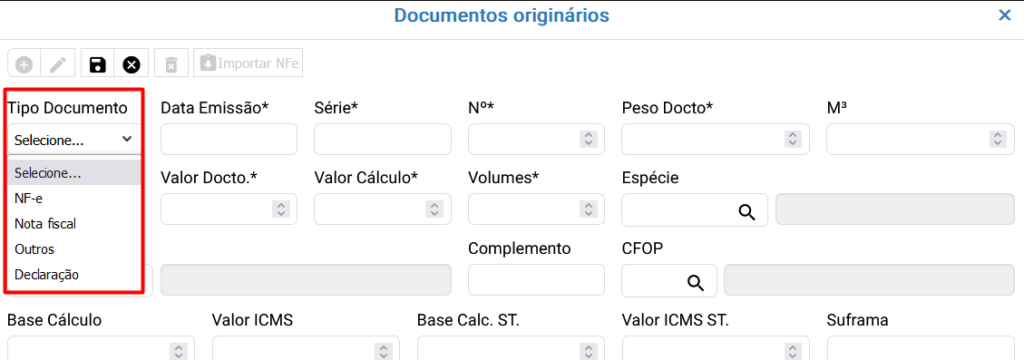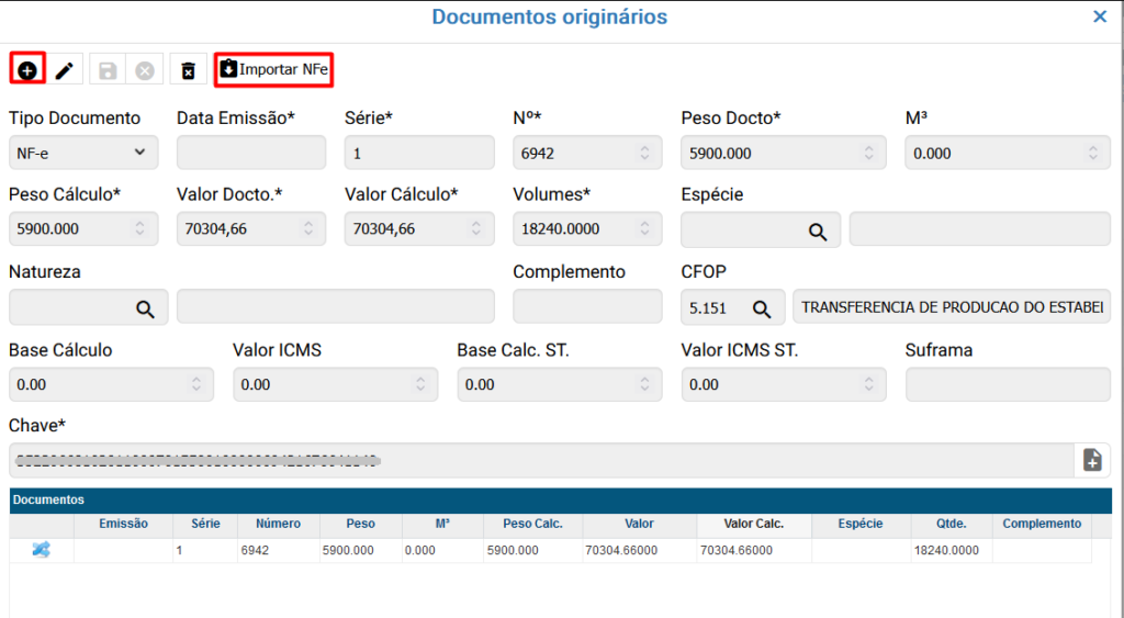 Os documentos originários podem ser cadastrados manualmente ou importados clicando no botão ![]()