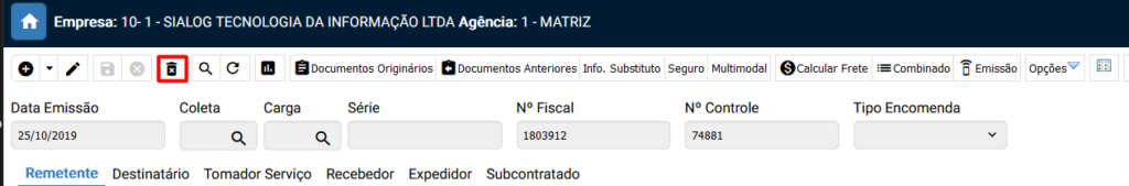 Para cancelar ou excluir o Cte, clique no botão do lixinho