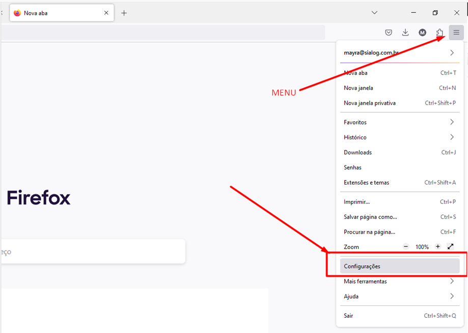 Acesse o MENU do Mozilla no canto superior direito e clique em CONFIGURAÇÕES