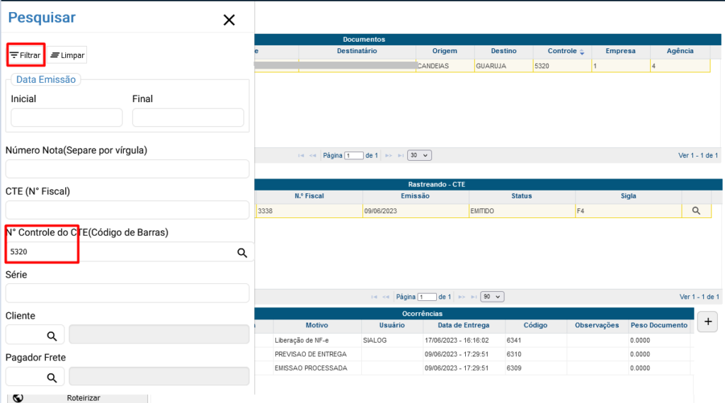 Informe o numero fiscal ou controle do Cte e clique em Filtrar