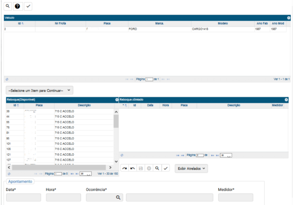 , após escolhido o veículo o sistema nos disponibilizará todas as placas dos reboques que estão aptos para atrelamento, conforme vemos na imagem abaixo: