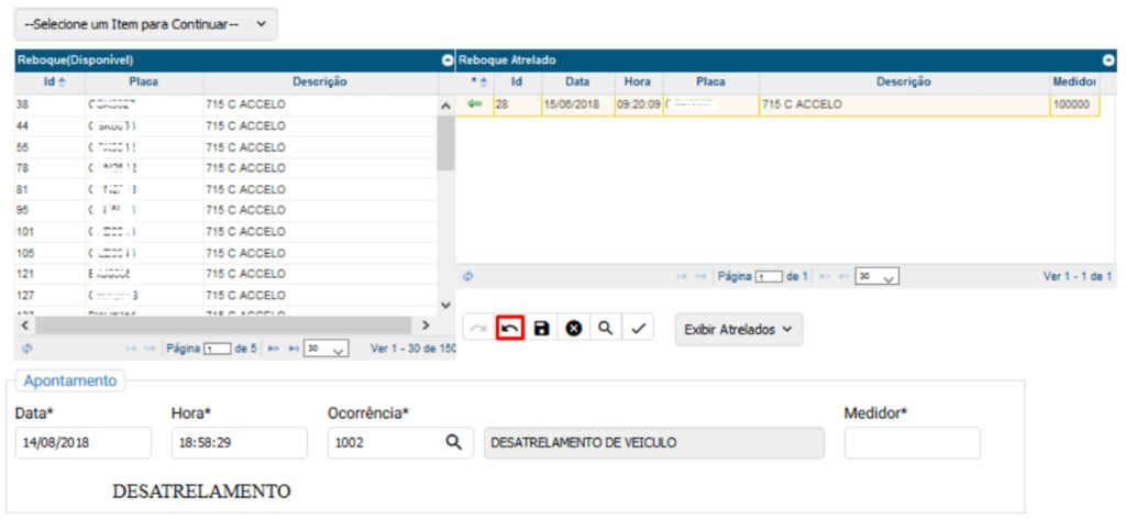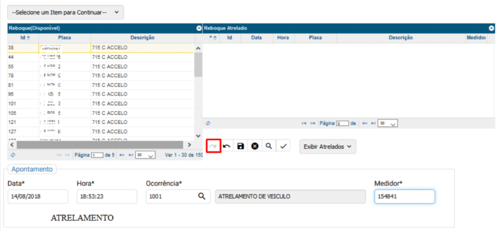 Deverá escolher o reboque que será atrelado e clicar na Seta