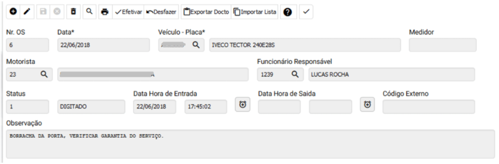 Basta apenas clicar no ícone novo e realizar o preenchimento das informações abaixo:De inicio preenchemos somente a primeira parte da ORDEM pois nem sempre sabemos tudo que será trocado pelo mecânico responsável, e no campo de observação incluímos o serviço a ser realizado conforme exemplo abaixo: