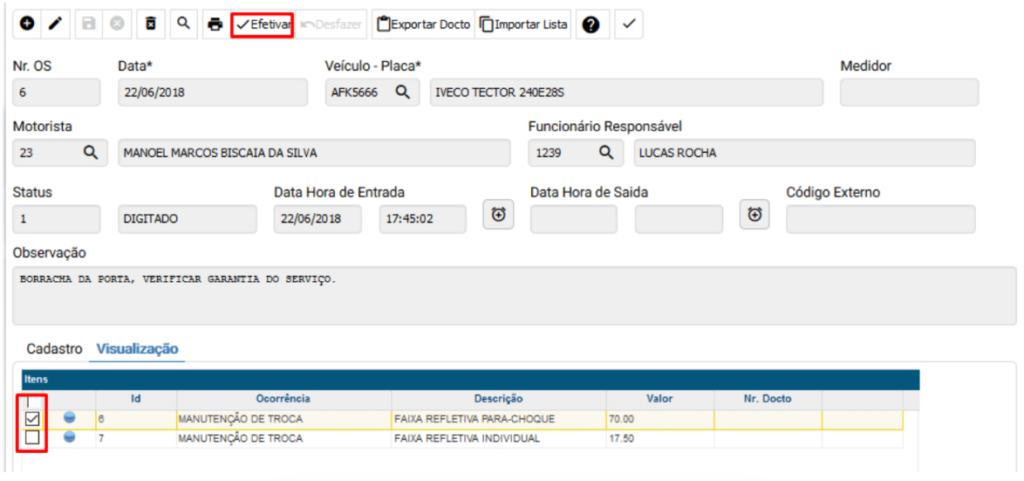 Após incluso todos os itens deveremos selecionar e clicar em efetivar para que assim esses produtos entrem nos gastos da frota.