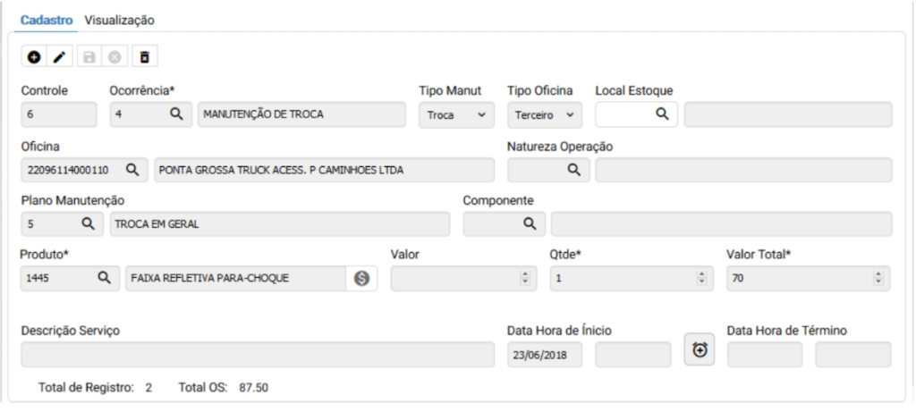 Após finalizado o serviço no veículo, podemos incluir todos os itens que foram feitos, conforme exemplo abaixo, basta apenas clicar no ícone novo e preencher as informações do que foi trocado e em seguida salvar os apontamentos.