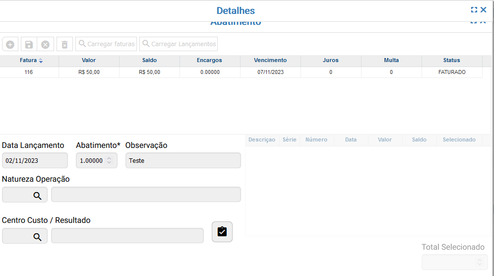 Ao lançar um abatimento, será realizado um desconto no saldo da fatura.