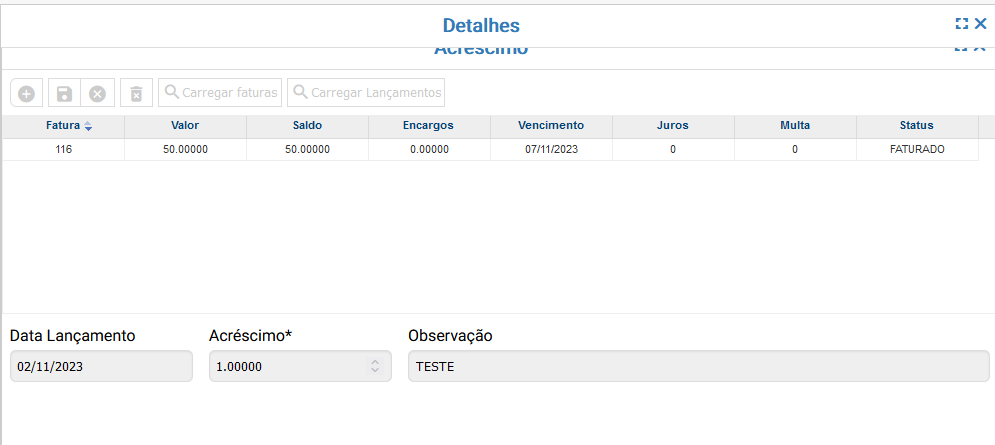 Ao lançar um acréscimo, será somado o valor informado ao saldo da fatura
