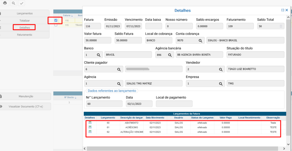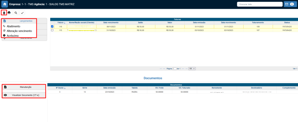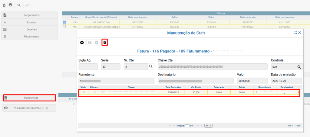Realizar a manutenção da fatura excluindo algum CT-e e também visualizar o CT-e.