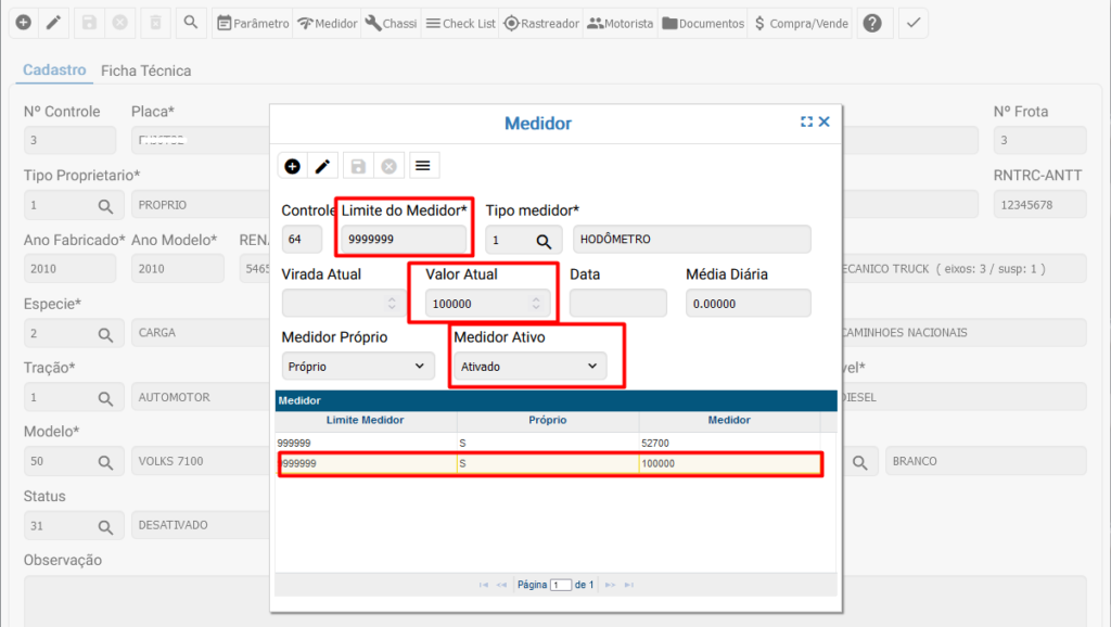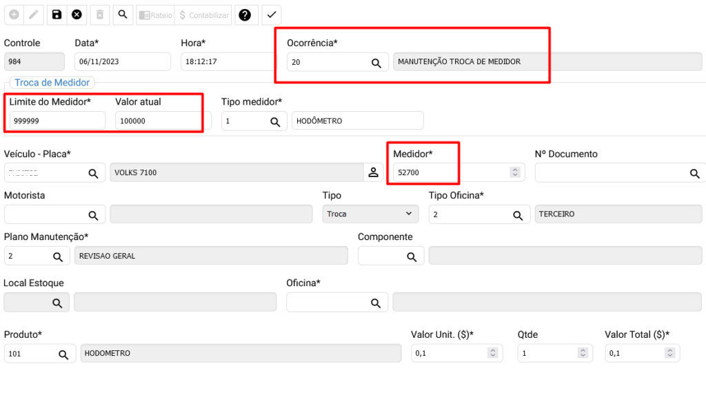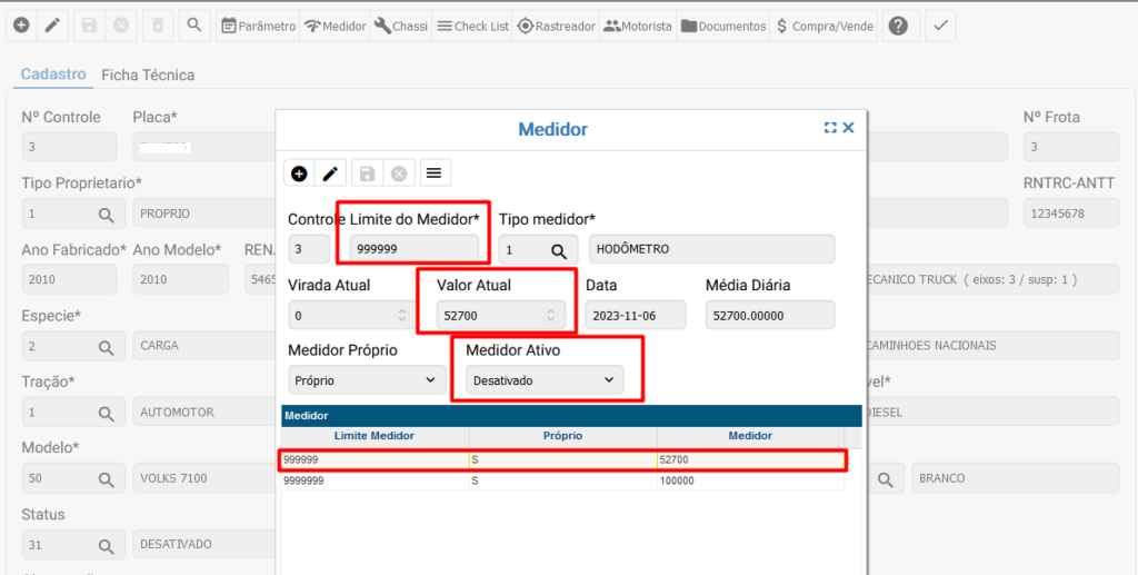 Após realizar o apontamento de troca de medidor, as informações relacionadas ao medidor no cadastro do veiculo, serão atualizadas e o medidor anterior será desativado e substituído.