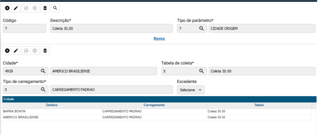 Depois será necessário cadastrar os parâmetros, onde em Cidade informar as cidades pertencentes a esse grupo. No campo Tabela de Coleta será a tabela que foi cadastrada anteriormente com o valor e o Tipo de Carregamento que será inserido no CTe.