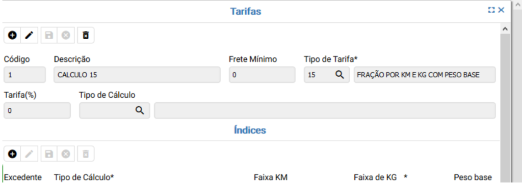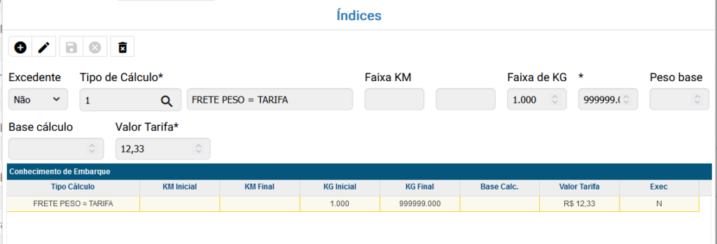 Por último cadastre os índices da tarifa, os índices são baseados no TIPO DE CÁLCULO e se o valor da tarifa será calculado como EXCEDENTE Sim ou Não.