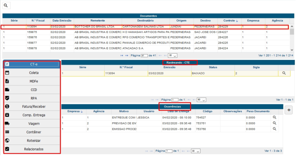 Clique no documento que deseja rastrear e verifique as ocorrências ou informações relacionadas a esse documento como CTe, Mdfe, Coleta, CCD, RPA, Fatura ou Viagem
