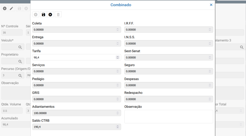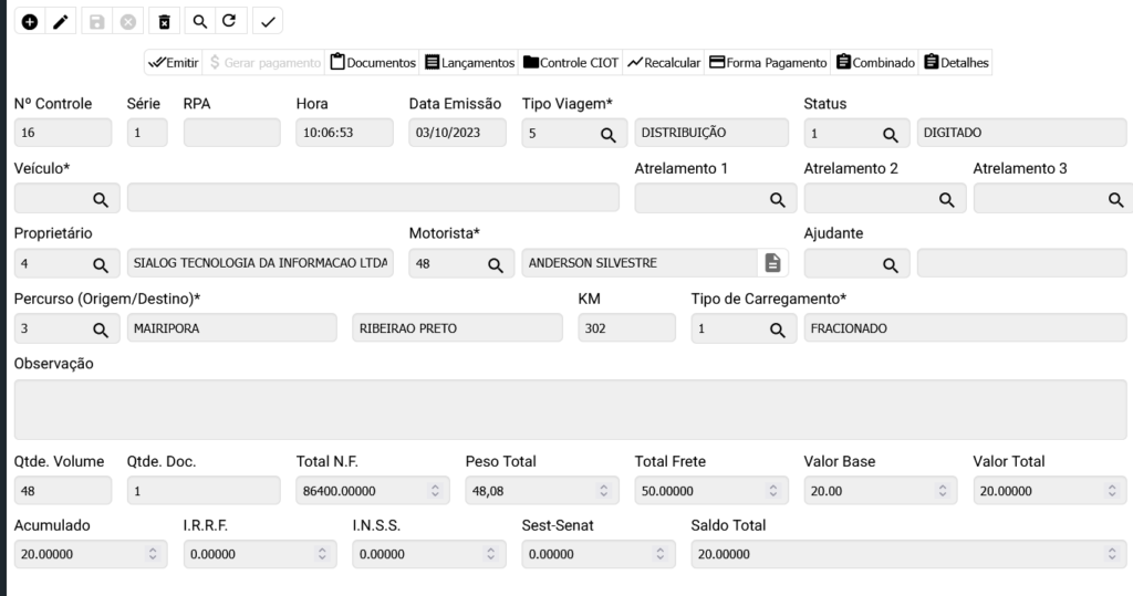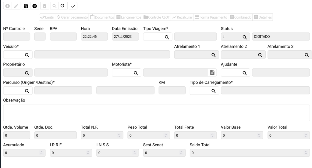 Depois de preencher as informações de Tipo de Viagem, Veiculo, Atrelamento, Motorista, Percurso e Tipo de Carregamento , clique em salvar ![]()