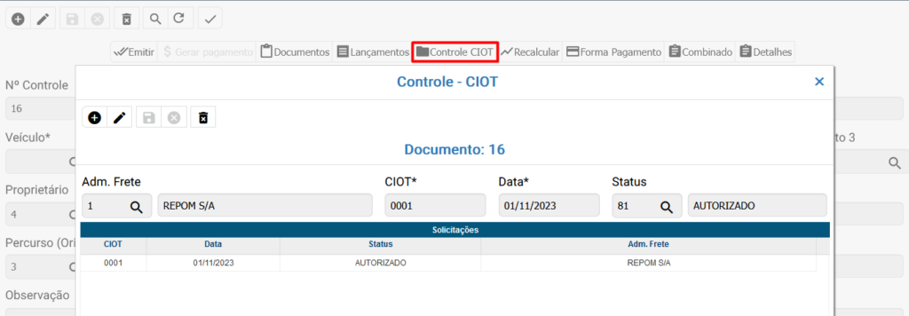 para informar o numero do CIOT que foi gerado pela Administradora de Frete.