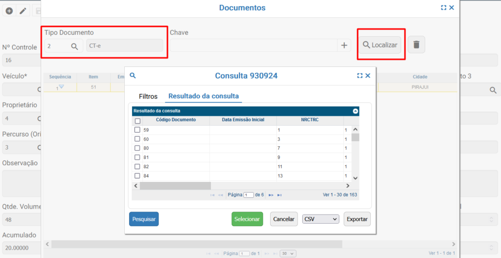 Insira o Tipo de Documento e o Código ou Chave, no caso de CT-e e clique no botão ADICIONAR