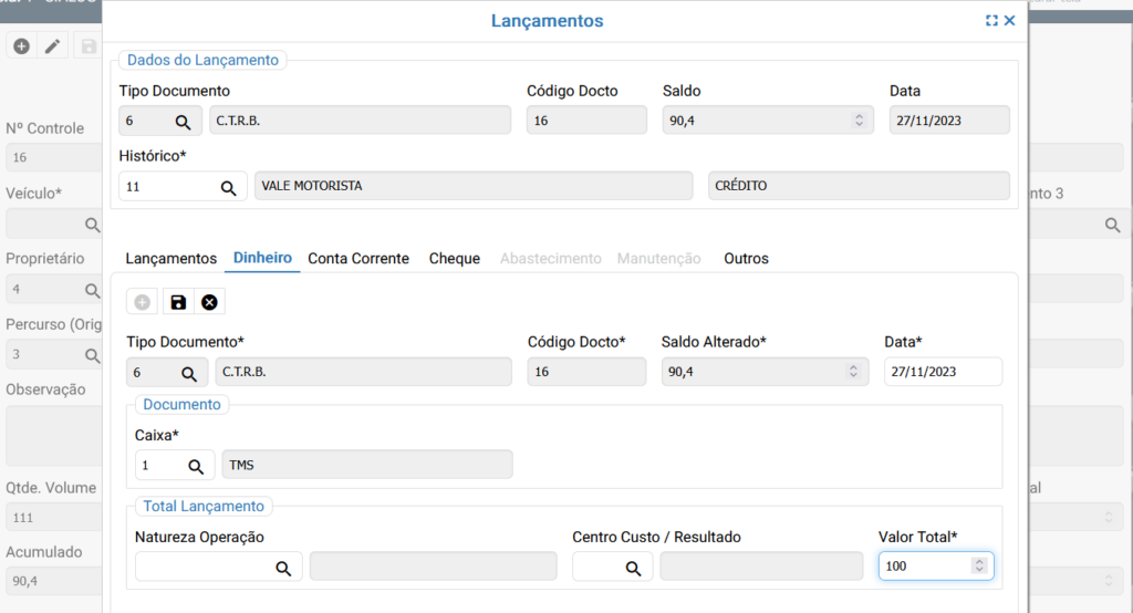para analisar os detalhes de cada lançamento feito no RPA, selecionando a aba Valores, Combinado, Lançamentos, Pedágio e Pagamentos.
