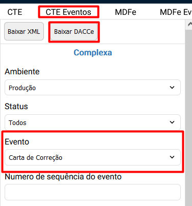 Para baixar a carta de correção , acesse a aba CTe Eventos >> Selecione o Evento Carta de Correção >> Selecione o documento e clique no botão Baixar DACCEe