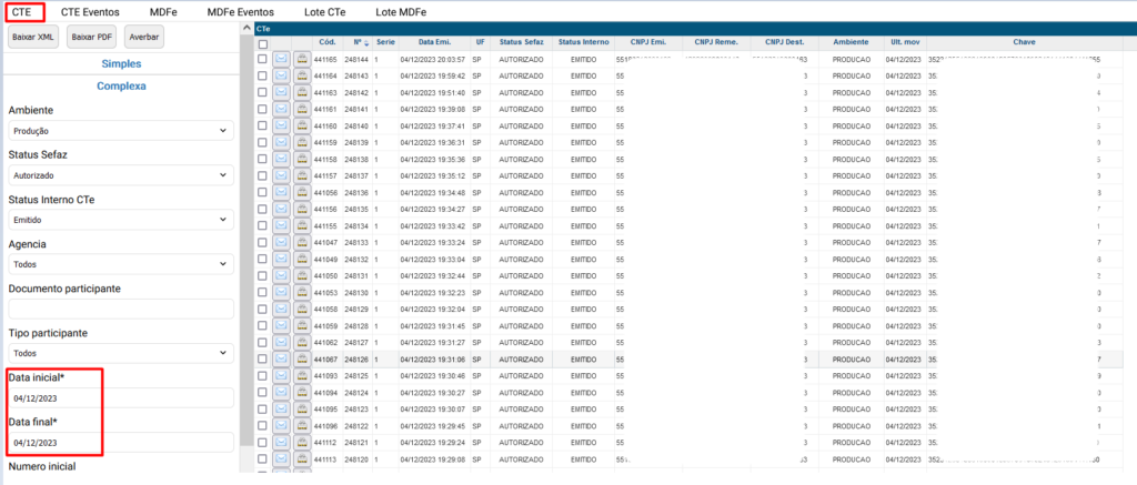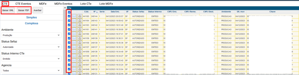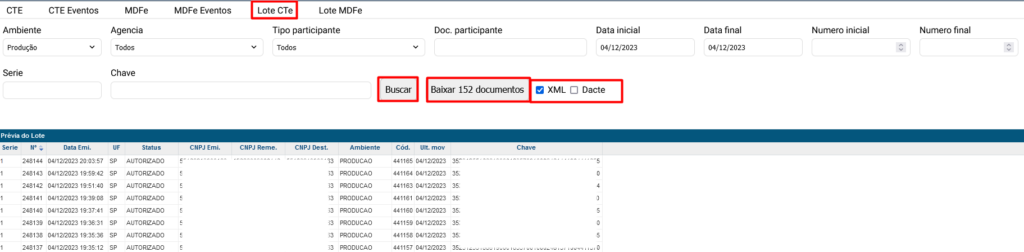 Para baixar o lote dos Ctes, acesse a aba Lote CTe, utilize os filtros e clique no botão Buscar e Baixar de acordo com os tipos de documentos selecionados.