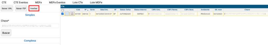 Acesse a aba CTE, informe a chave do Cte para consulta-lo individualmente através da consulta Simples.