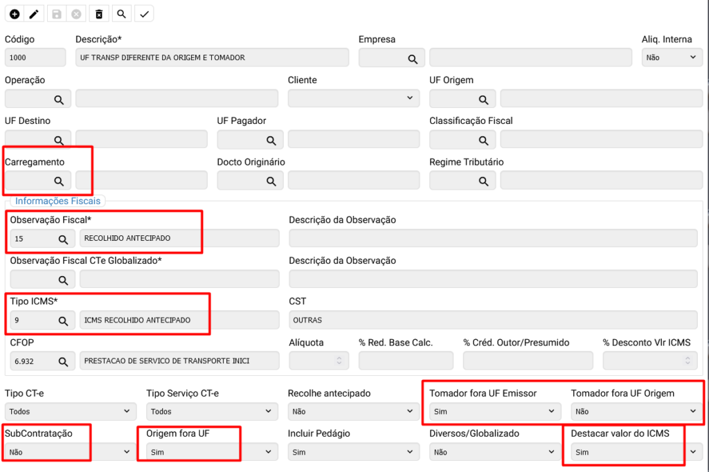 Tomador fora UF Origem: A regra será acatado a todos os Ctes em que o estado do tomador é diferente ou igual ao estado de Origem da Carga (Remetente ou Expedidor)
