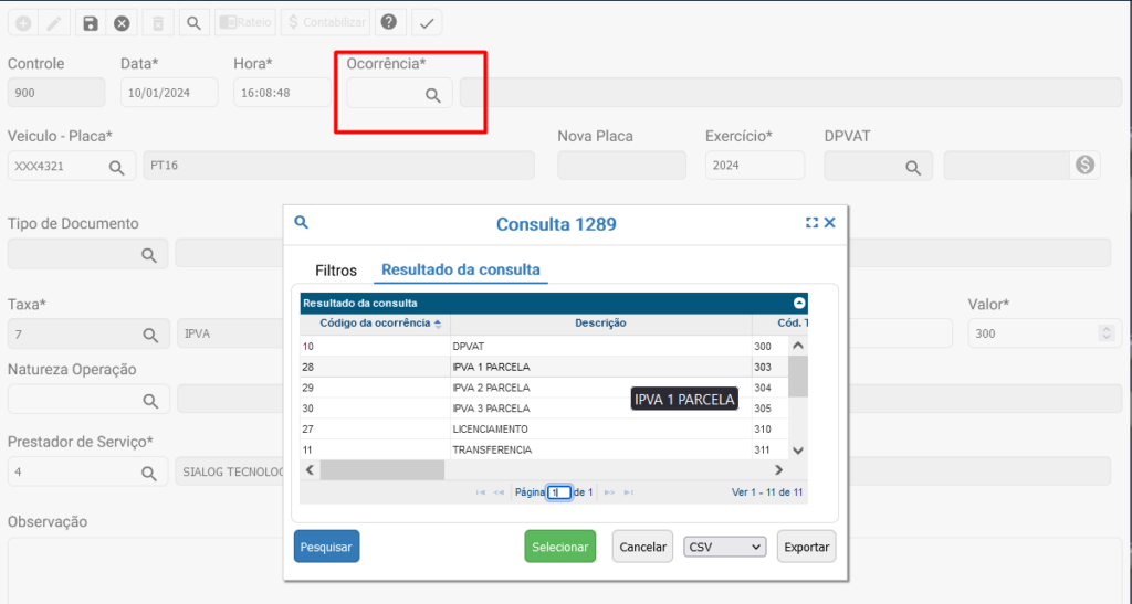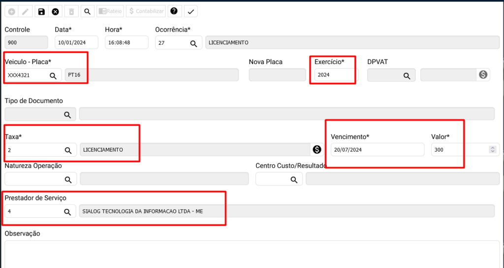 Após selecionada a ocorrência o sistema irá nos informar os campos que serão obrigatórios para preenchimento, conforme vemos no exemplo abaixo com a ocorrência de Licenciamento