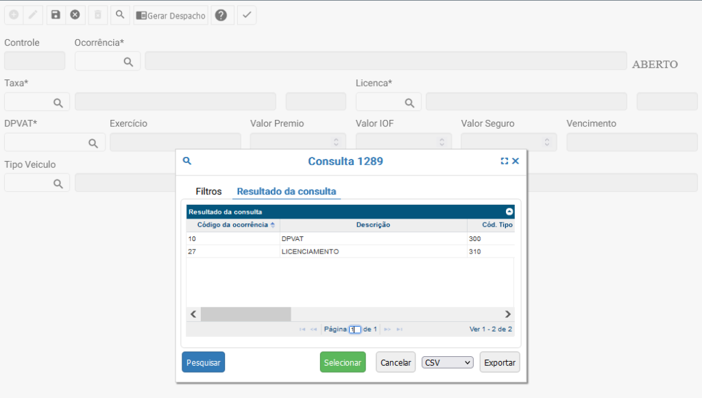 Os campos serão habilitados conforme a ocorrência selecionada