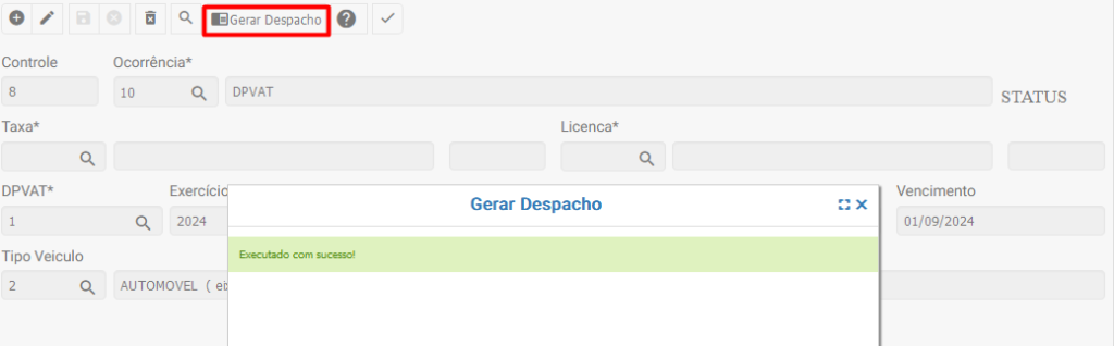 A tela de Geração de despacho é utilizada para efetuar os lançamentos dos despachos dos veículos pertencentes a empresa de forma automatizada para todos os finais de placa e tipo de veículos que se enquadrarem nos tipos de filtros Taxas e Licença.